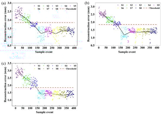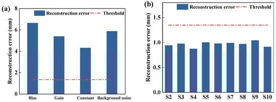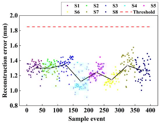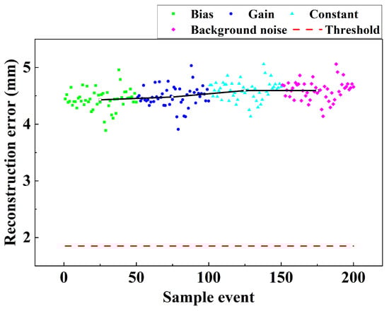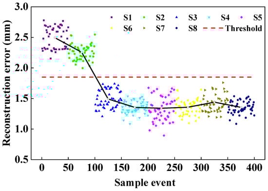 - The threshold of the training sample’s reconstruction error is calculated using Equation (14).