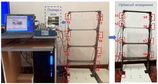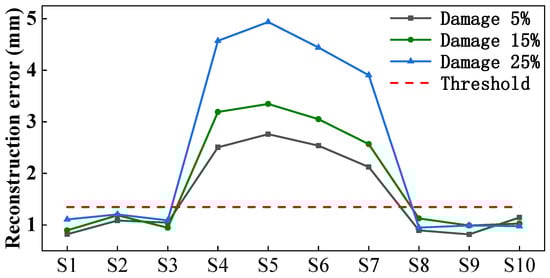 It can be found in Figure 19 that when the damage degree of the structure is 10%, the reconstruction errors of S2 do not all exceed the threshold. This may be because S2 was not on the same layer as the damaged area. When the structure was only slightly damaged, the acceleration changes little before and after the damage. It is worth noting that, the placement of the sensors plays a crucial role in the quality of the monitored information [,,]. In order to improve the accuracy for damage identification of steel frame structures, we optimized the sensor placement based on the structural damage recognition results, as shown in Figure 15. Then, the response signals of the structure in the healthy state were re-collected to form the training and validation data, and the response signals of the structure in the 10% damage state were collected to form the prediction data. The structure of the dataset is the same as in the previous experiments. Figure 21 shows the results of structural damage detection using the proposed framework. It can be found that the reconstruction error of both S1 and S2 exceeds the threshold value, thus the identification result is that structural damage has occurred near S1 and S2. It can be concluded that the recognition accuracy of the proposed framework for slight structural damage can be improved after the optimization of the sensor placement of the structure.