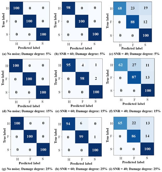 Detection results with different degrees of damage. (a) 10% damage degree; (b) 30% damage degree; (c) 50% damage degree.