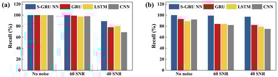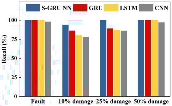 The GRU, LSTM, and CNN models in Section 4.1 were used to compare with the S-GRU NN and recall was used to measure the isolation performance of the framework using different algorithms. The results are shown in Figure 20, and it can be found that all four frameworks can accurately detect sensor failures and structures with 50% damage, due to the large error between the measured and reconstructed signals in both cases. However, when the structural damage is low, the S-GRU NN can detect more damage samples because of its better reconstruction accuracy and robustness. Therefore, we can conclude that the isolation method based on the S-GRU NN performed better.