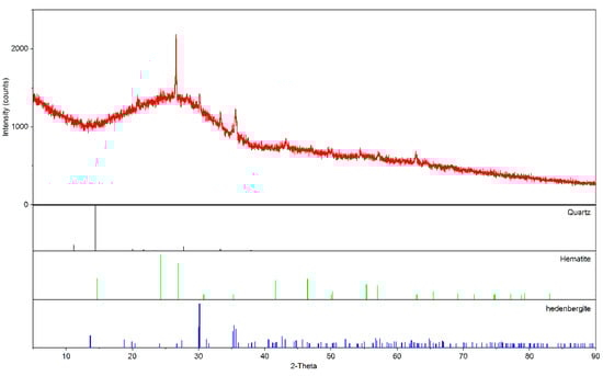 As can be seen in Figure 2, the waste vitreous enamel is composed from the crystal and amorphous phases. The main composition of the crystal phase includes quartz, hematite, and hedenbergite. The amorphous components are indicated by a big bump background in the 2θ range of 15–35°. The amorphous phase originates from glass matrix of vitreous enamel, which mainly contains Si and Al. A high content of Fe in the vitreous enamel is proved by the results presented in Table 4, and it mainly exists as the form of hematite and hedenbergite.
