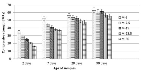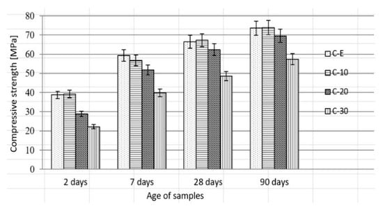 Compressive strength is the most significant characteristic of concrete, and it was determined at the age of 2, 7, 28, and 90 days. The results are shown at Figure 7. From presented results, it can be seen that the C-10 concrete mixture had a higher value of compressive strength relative to the reference concrete for all ages. On the other hand, with the increase of cement replacement by waste vitreous enamel by more than 10%, the strengths of concrete specimens decreased for all ages. In the first 7 days, the concrete strengths of mixtures C-E and C-10 had the highest increase, while after increasing ages, the compressive strength of concrete made with waste vitreous enamel was higher than the reference one due to the delayed pozzolanic reaction. A similar conclusion was reached by authors [,,] in the study of durability of concrete supplemented with recycled CRT glass as cementitious material.