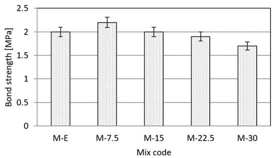 The replacement of cement with waste vitreous enamel resulted in a reduction in the adhesion of the mortar in comparison with concrete substrate, with an exception for cement replacement of 7.5%, when an adhesion strength increased 10% and 15%, where the adhesion is equal to that of M-E. With an increase in the percentage of cement replacement in an amount higher than 15%, the adhesive strength decreased with a maximum reduction of 15% for the M-30 sample. The lower limit of adhesive strength for repair mortars is 1.5 MPa, thus, all tested mortar mixtures meet this condition. It should be noted that in all samples the fracture was at the junction between the mortar and the substrate.