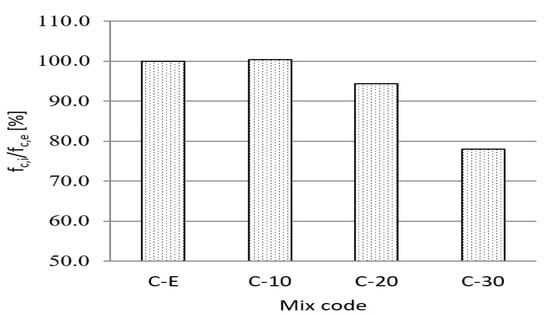 The content of air entrained into fresh concrete decreased with the increasing percentage of cement replacement. The reference mixture had the highest percentage of entrained air (2.6%), while the C-30 mixture had the lowest (1.3%). This can be attributed to the better placing of concrete mixed with waste material.