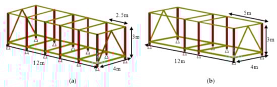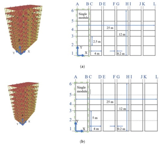 The alternative load path method was used to assess the progressive collapse mechanisms and robustness of the modular buildings in this study. The robustness of the modular building to prevent progressive collapse was investigated through linear static, nonlinear static, and nonlinear dynamic analyses using SAP2000 []. Two ten-storey braced modular buildings with the height of 35.4 m were selected as the case study buildings (see Figure 1a,b); they are named as Building A and B, in this paper. These two buildings have similar plan areas with different spans, beams and columns (Table 1). Chevron bracings were used for the faces of the modules, while the sides of the building (Grid A and L) and the centre (Grid F and G) were braced using cross bracings.