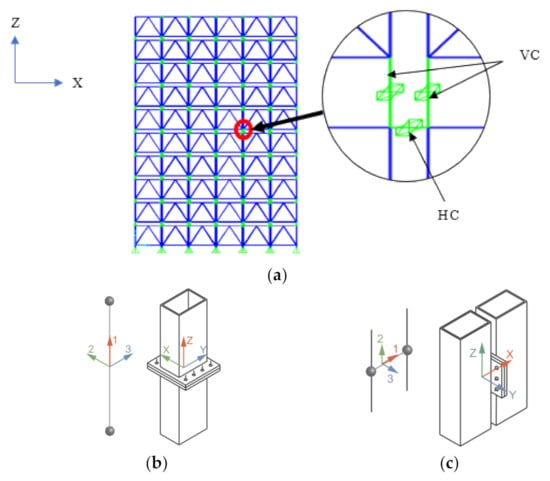 Six modules were lined in the X direction, and ten modules were stacked in the Z direction to form the building. Two types of inter-modular connections were considered in the building. The horizontal connections (HCs) were used to connect the modules in the X direction, and the vertical connections (VCs) were used in the Z direction to connect the stacked modules as shown in Figure 2. The “1”, “2” and “3” notations are used to indicate the directions of the local axis (Figure 2b,c).