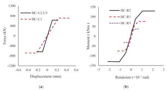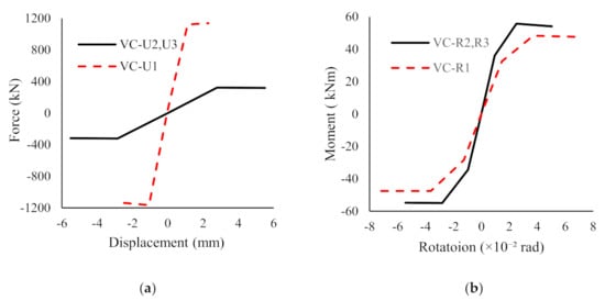 The modular building cases considered were numerically modelled and analysed through the commercially available finite element (FE) software SAP-2000 []. Frame elements were used to model columns, beams and bracings, while shell elements were used to model slabs. The intra-module connections were assumed as rigid connection [], whilst inter-module connections were replaced with non-linear link elements. The moment curvature and force displacement relationship of the inter module connection were obtained from the research conducted by Lacey et al. [] and those were used in the FE models. Further, Lacey et al. [] study states that a one HC should be used per module column, which in reality exists in between the columns of the upper and the lower modules. Thus, in this study a HC was used at the level of ceiling beams to connect two adjacent modules. Similar modelling techniques were used in the previous studies as well [,]. Figure 4 and Figure 5 show the translation and rotational behaviour of the VC and HC, respectively. The translation in each direction is indicated by the letter “U” and the rotation is indicated by “R”. A dead load of 0.6 kN/m2 was applied on the floor to represent the self-weight of the floor slab. The super-imposed dead loads acting on the floors and ceilings of the building due to the finishes and services were assumed as 1.0 kN/m2 and 0.5 kN/m2, respectively, in the FE models. Furthermore, a 4.5 kN/m line load was applied on the floor beams to represent the exterior walls and claddings of the building. A live load of 1.5 kN/m2 was applied.
