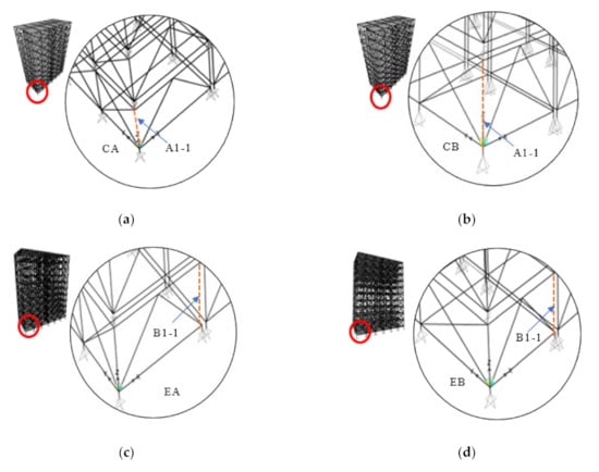 The structural integrity of the buildings was checked by analysing the behaviour of the structure under a loss-of-column scenario, stimulated through three column removal scenarios. GSA guideline [] was followed when selecting the locations to remove columns to trigger progressive collapses; they were (1) a column at the corner of the building, (2) a column along the edge and (3) an interior column. The same columns (denoted locations) were removed in both building types analysed to compare their load-resisting mechanisms. The columns were labelled to represent the identity of the grid location and the storey level. For example, in the column label B1-2 (see Figure 1), the first letter represents the location on the X axis (grid B), the next number represents the location on the Y axis (grid 1), and the number in the end represents the storey at which the column is removed (level 2). A1-1, B1-1 and B3-1 were the columns removed to stimulate the progressive collapse according to the GSA guideline [].