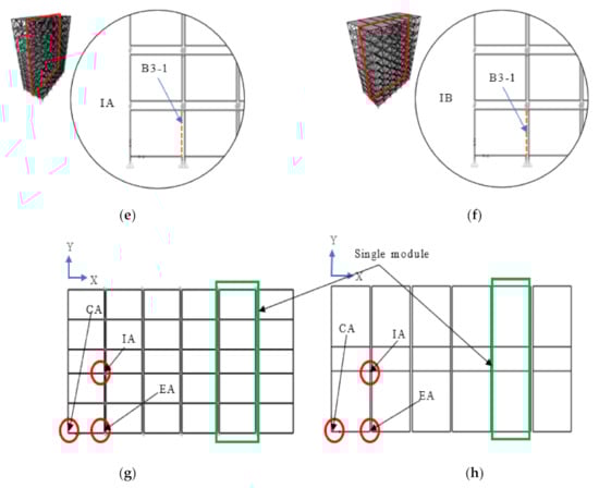 Column removal scenarios of Building A: (a) CA; (b) EA; (c) IA; and Building B (d) CB; (e) EB; (f) IB; and plan view of (g) Building A; (h) Building B with the removed column locations.