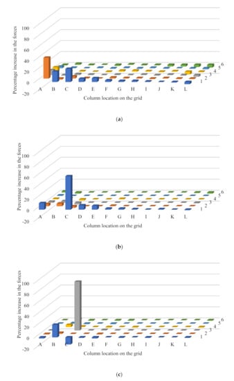 Percentage of change in force in ground floor’s columns in: (a) CD1A; (b) ED1A; and (c) ID1A with Accidental Load case in Building A without column removal.