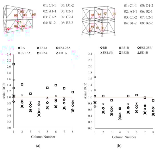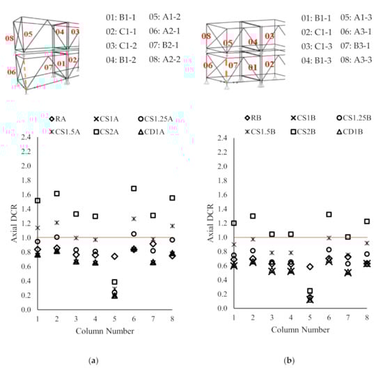 The demand capacity ratio (DCR) of the elements is derived using Equation (7), and the DCR was used to analyse the robustness of the building. Figure 8, Figure 9 and Figure 10 show the DCR variation of the eight columns in different loading and analyses methods used. Figure 8 compares the axial DCRs of columns between Buildings A and B, when the corner column was removed. The highest DCR recorded for the columns for CD1A and CD1B (column A2-1 and column A3-1) is 0.8 and 0.7. These results indicate that the capacity of the columns does not exceed in the dynamic column removal. Further, Figure 8a indicates that the highest increase in the axial DCR for CA was observed in column A2-1, the column behind the removed column (A1-1). The axial load in column A2-1 for CS1A, CS1.25A, CS1.5A and CS2A was, respectively, 1.0, 1.3, 1.5 and 2.0 times the force in RA. For CD1A, the force was similar to that from both RA and CS1A. When comparing the forces of the columns on the ground floor, column A2-1 shows a 29% higher force than the force in B2-1, which experienced the lowest force among the considered columns. The highest increase in axial DCRs was observed in CB at column A3-1, which was located behind the removed column A1-1 (Figure 8b). The behaviour of the columns in CB was similar to the CA, where the DCR of column A3-1 in CS1B, CS1.25B, CS1.5B and CS2B were, respectively, 0.9, 1.2, 1.4 and 1.9 times the force in RB. Moreover, the force in column A3-1 for CD1A was equal to the RB. The force in column A3-1 was 33% higher than the force in B3-1, which showed the lowest force among the considered columns on the ground floor. The column A1-2, which was above the removed column, experienced a lesser force in all the analyses scenarios when compared with the force in RA. It implies that the loss of support below reduces the axial force in the column and it tends to share the forces with the other adjacent columns.