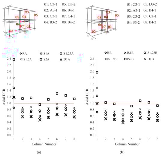 In the IA scenario, the moments in FB01 in IS1A, IS1.25A, IS1.5A, IS2A and ID1A were, respectively, 0.7, 0.9, 1.1, 1.5, and 0.7 times higher than the moment of the beam in RA (Figure 13a). The moment DCRs experienced by the beams in the IB scenario are shown in Figure 13b. In the cases of IS1B, IS1.25B, IS1.5B, IS2B and ID1B, the moments in FB01 were 0.6, 0.7, 0.9, 1.2 and 0.6 times the moment of the beam in RB, respectively. Similar beam behaviour was observed in all three column removal scenarios in each building. For the beams in Building A, all the column removal analyses generated a maximum DCR of 0.7.
