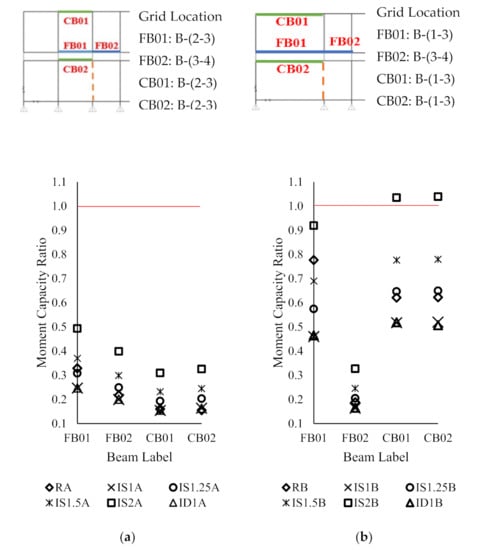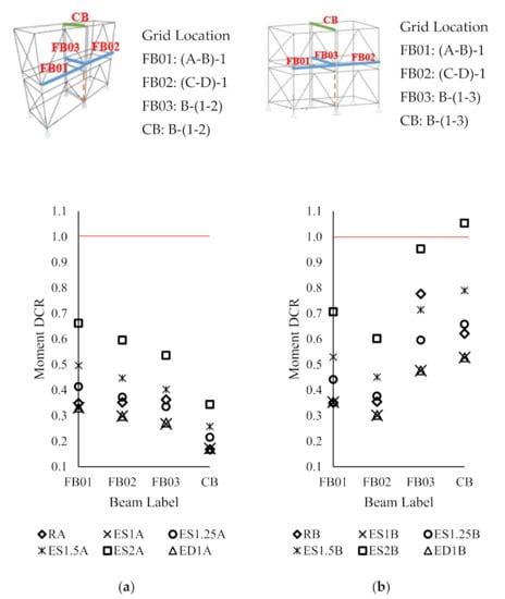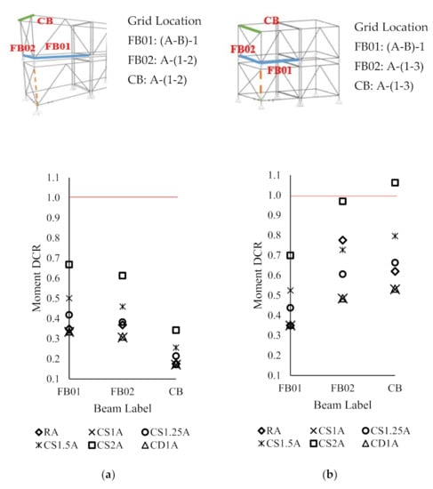 Figure 11, Figure 12 and Figure 13 show the DCR of floor and ceiling beams bending moments in Buildings A and B. When considering CA, the moments of FB01 in CS1A, CS1.25A, CS1.5A, CS2A and CD1A are, respectively, 1.0, 1.1, 1.4, 1.9 and 1.0 times the moments of the beam in RA (Figure 11a). In CB the moments in FB 02 in CS1B, CS1.25B, CS1.5B, CS2B and CD1B scenarios are, respectively, 0.6, 0.8, 0.9, 1.2 and 0.6 times the moment of the beam in RB (Figure 11b). Although higher DCRs can be seen in CB, the load increments with respect to RB are comparatively low. This is due to the higher moments due to higher factored loads in ULS loading conditions. The higher DCR shown in CB is due to the lesser capacity in the members used for the ceiling beams.