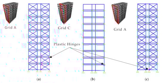 Formation of hinges in Building B in the dynamic analysis: (a) Corner column removal (CB); (b) Edge column removal (EB); and (c) Interior column removal (IB).