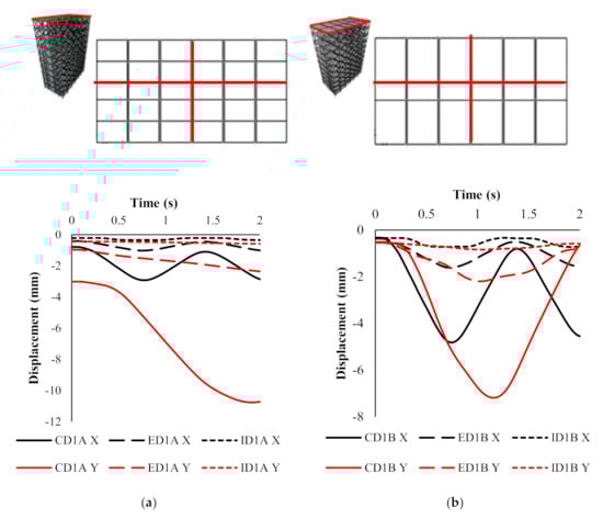 The lateral deformation in the building during the dynamic column removal with 1% damping was studied. Figure 15 represents the deformation of the joint near the centre of the roof (G-4 point on the grid) in all three column removal scenario analyses. The results show that the displacement due to corner column removal was significantly higher than in the other cases considered. Higher oscillations were observed in Building B in the range of 1.7–2.7 Hz. Amplitude of the displacement in the Y direction was higher in Building A, while the amplitude for the X direction was higher in Building B.