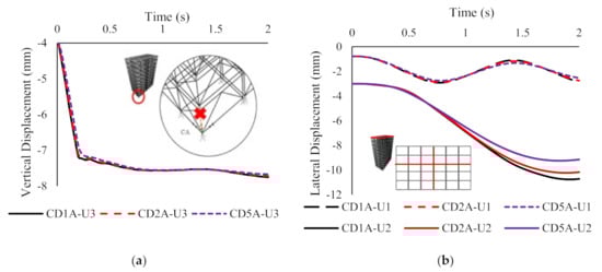 The variations of damping ratio with the vertical displacement at the joint of the removed column and lateral displacement near the centre at the roof of the building (G-4 on the grid) are presented in Figure 16. It can be noted that the variation of damping of the building significantly influences the stability of the structure. The highest stability effect was induced through damping occurred when the corner column was removed, whilst a lesser impact was observed in the other two scenarios (edge and interior column removal). Therefore, the data of corner column removal were used to present the behaviour of all three scenarios. Figure 16 shows the displacement of the considered locations of CA in dynamic analyses with different damping ratios. It was identified that the displacement due to the 1% damping ratio was higher than in the other cases, although the increment is not significant. Similar behaviour was observed in the research done by Kiakojouri et al. [].
