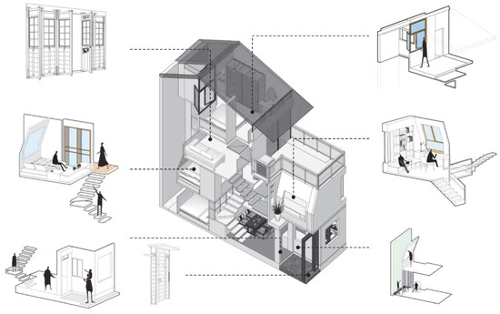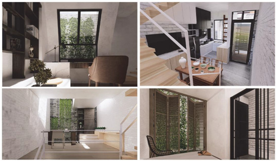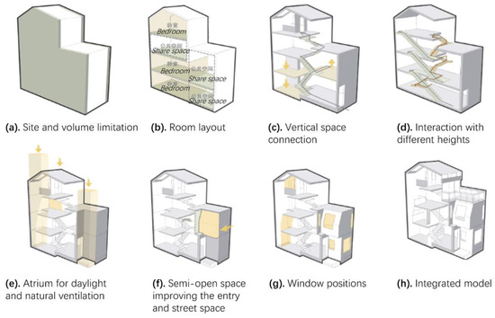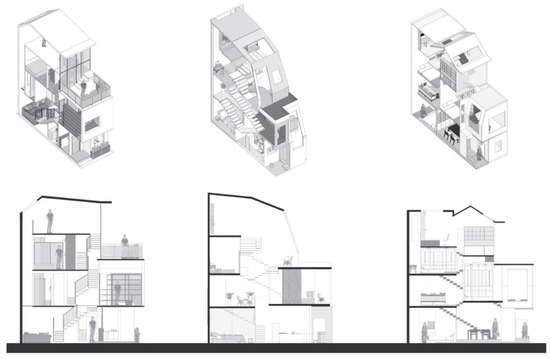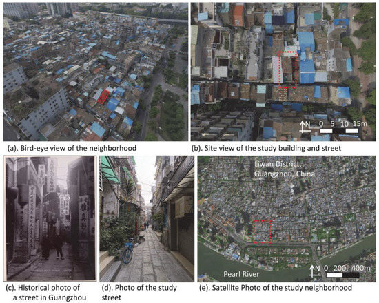 The program was based on a vernacular house that had been built over 90 years ago in a historical urban area in Guangzhou, China (Figure 3). High-density neighborhoods were formed in the 18th and 19th centuries because of the harbor development. The layout of the neighborhood, in which each house was arranged side by side with a shared wall, limited the building height and retained the character of urban morphology over the decades. The form of this house was also known as a shophouse or townhouse in Singapore, Malaysia, and other countries [58,59]. In Guangzhou, two typologies emerged in the urban development. The shophouses were mainly planned along the main roads and known as “Arcade Street (Qi Lou)” [60]; the townhouses were mainly built in the neighborhoods with narrow streets and known as “Bamboo Shape House (Zhu Tong Wu)” in Guangzhou [61].