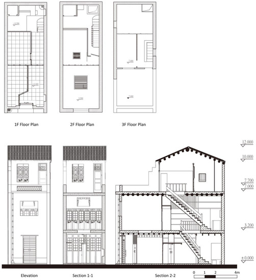 The vernacular urban house in this study was named “Bamboo Shape House” in Guangzhou owing to the narrow and long layout of the floorplans (4 m width and 15 m length; Figure 4), which shared both brick walls with the neighboring houses. These houses were built for both living and cargo storage in the last decades.
