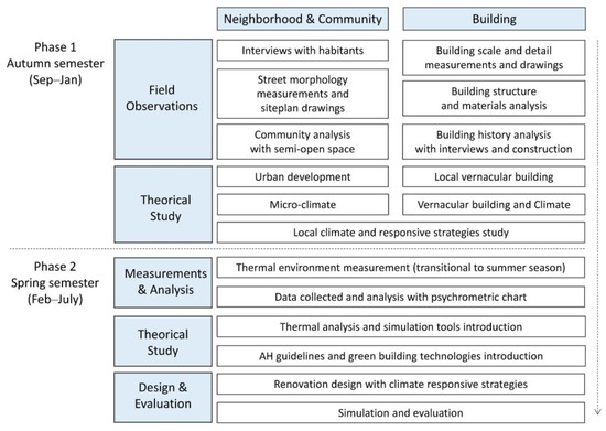 As a pedagogy program, this study combines multidisciplinary methods including social and technological approaches on neighborhood and building aspects in the training process. The perspective of climate-responsive design acted as the core of the program. The renovation concept design was conducted based on the research. As the program lasted two semesters, different methods were promoted within the program process (Figure 5).