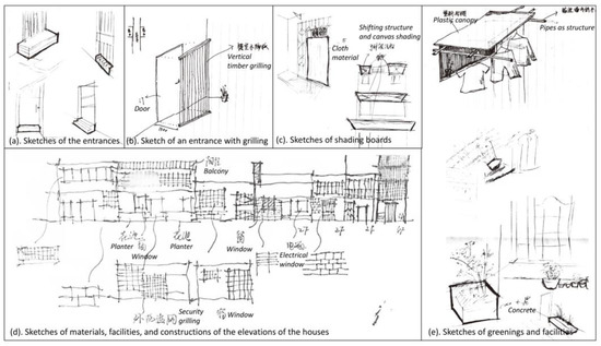 A social perspective was introduced to reveal the interaction of the in-between space in the narrow street. According to Zhang et al. [56], the interaction factors between public and private found in the study street included greenery, steps, paving materials, windows with grilles, facilities, and religious items. Different items formed an active or negative space in the street. Students were encouraged to discover and record how the residents used the space in front of or around their houses and how this changed the quality of the street (Figure 7). The spontaneous, shared activities of the residents in the streets were studied and led to a much more active relationship between the private and public space in future renovation designs.