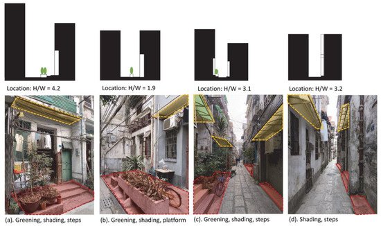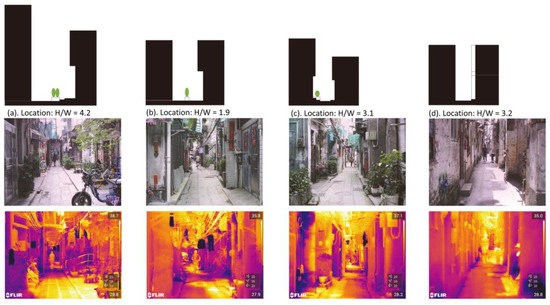 The urban morphology was investigated via site surveying and measurements of the street scales. The results of field measurements revealed that the floor area ratio (FAR) of the neighborhood was approximately 2.8, the density of which was approximately 74%. The width of the streets was 2–4 m and the aspect ratio of the street was found to be approximately 1.9–5.2 (Figure 6), revealing its dense character. The streets in the neighborhood were mainly orientated east to west owing to the houses mainly facing south. The narrow street space may limit the amount of daylight and natural ventilation for the houses; however, it may also reduce the solar radiation in the street. Measurements of the thermal environment were conducted, and the results will be presented in later sections. The site survey and measurements provided the students with a better understanding of density and its problems that supported the concept design considering the relationship between the house and the street.