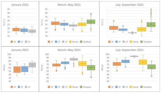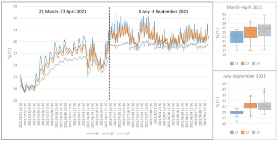 To gain a deeper understanding of the hot-humid climate and thermal environment [65], the students took field measurements of the thermal indices in the study house. The equipment used was a HOBO data logger (U23 Pro v2) and HD32.3 with a globe thermometer probe and an omnidirectional hot wire probe [66]. These were installed at a height of 1.5 m on each floor of the house. Comparably, two HOBO data loggers with shading shields were installed in the street outside the house and in an open space in a middle school at a distance of approximately 300 m. The measurements took place from January to September in 2021, covering the transitional and hottest months in the hot-humid climate [67]. A thermal imager allowed the students to take images from the street and the building to gain a more intuitive understanding of the effects of the street canyon as well as the building materials (Table 3).