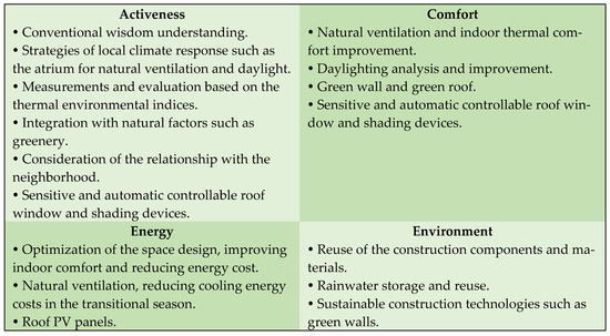 The ASAH consists of four main categories including “Activeness”, “Comfort”, “Energy”, and “Environment”. Each category was defined as three hierarchies including “Prerequisite Items”, “Scoring Items”, and “Optional Items” with a total of 46 clauses (Table 4). As the ASAH was a standard released by the China Architecture Association, it was practiced much more as a simple guideline for architects that integrated with or linked to other national standards in China, such as the Indoor Air Quality Standard (GB/T 18883-2002), the Code for Design of Sound Insulation of Civil Buildings (GB 50118-2010), and the Design Standard for Energy Efficiency of Public Buildings (GB 50189-2015) [69].