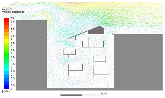 In the evaluation of natural or mechanical ventilation, the computational fluid dynamic (CFD) method is widely applied in practice and research. Urban morphology, outdoor environment, and indoor ventilation are different objects and scales in the studies of CFD simulations [74,75], connecting to the strategies on climate-responsive strategies. However, considering the computation resources and time, a simple 2D instead of 3D CFD method [76] launched in Ansys Fluent (Version 16.0, 2014 ANSYS, Inc., Canonsburg, PA, USA) was also introduced for the simulation of natural ventilation in a building section. The solving model was the two-dimensional steady-state Reynolds-averaged Navier–Stokes (RANS) equation with the Boussinesq approximation for the realizable k-ϵ turbulence model [77,78]. The second-order scheme was applied in the mean flow, turbulence, and energy equations discretization. The SIMPLEC scheme was applied in the coupling calculation with pressure and velocity. The convergence criteria of the continuity, velocity, and energy model were set to 10−5 [79].
