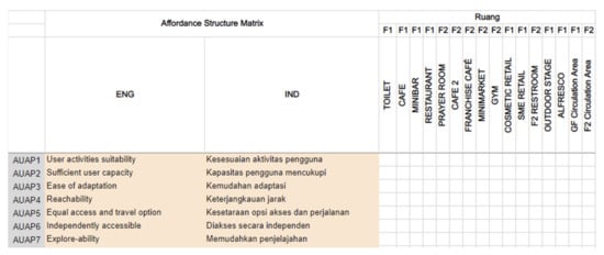 The affordances definition procedure in the affordance-based design framework necessitates architectural designers with experience or knowledge of the designer building’s surroundings. It comprises information about what users may and cannot do in the building and what the building can and cannot do. The team utilized the affordance structure matrix [] to determine whether a design contains the needed affordances to enable a specific behavior while avoiding individual behavior. Positive AUA (AUAP), negative AUA (AUAN), positive AAA (AAAP), and negative AAA (AAAN) are the four types of affordances in the ASM. In this study, we used a reduced version of the ASM, omitting the “roof” and “side” components because intradomain relationships were not considered, as seen in Figure 1.