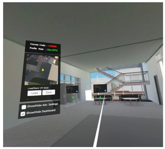 As part of the study, we created the virtual reality design reviewer, or VRDR, a game-engine-based VR system for analyzing architectural design studio outcomes, as shown in Figure 2. It was created to assist students in an architectural design studio course in understanding and evaluating their concepts. The system was created using the Unity game engine and is optimized for standalone VR head-mounted displays such as the Oculus Quest. We decided to use a game engine because it provides real-time 3D rendering, interactivity, and collision detection as its underlying strengths []. VRDR was designed to run without requiring high-end personal computer (PC) specs. In a VE, VRDR allows the user to view design studio outcomes in a BIM model. We wanted to offer VRDR as a VR system for analyzing studio design solutions utilizing the affordance-based design approach, depending on the objectives assigned in the design brief. The VRDR system has been discussed as a whole separate discussion [].