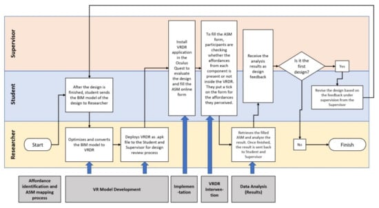 Before the simulation started, we performed each project’s “Affordance identification and ASM mapping process” procedure. So, we had one ASM for each project used for the design review process. Then, once the design was finished, the student sent the BIM model of the finished design to us as the researchers. The model was optimized and converted into the VRDR system through “Model optimization and conversion to VRDR” and “VRDR system improvements” procedures. Once it was ready, researchers deployed VRDR as an APK file and sent it to the student and supervisor—the participants—for installation. Then, participants performed the design review process—all the results were submitted online. To fill in the ASM form, participants checked whether each component’s affordance was present or not inside the VRDR. They put a tick on the form for the affordance pair they perceived if it was present.