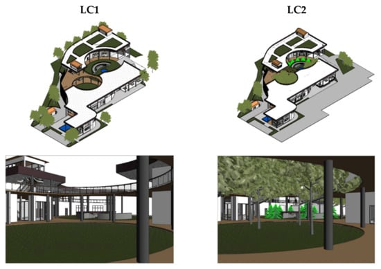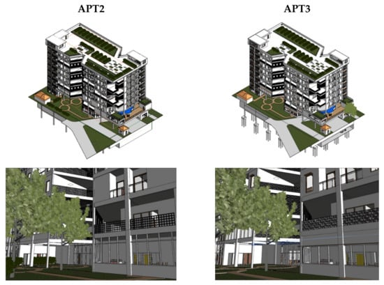In Part 1, there were five design options reviewed by the participants. Two design options came from the lifestyle center project (LC), and three design options were from the apartment project (APT). For LC, the design options were taken from the submitted design for grading (LC1) and revised after the first design review process (LC2). For APT, they were taken from the snapshot model while the design process was ongoing (APT1), the proposed design for grading (APT2), and the revised design after the proposed design review process (APT3). However, since the student could not catch up with the tight schedule of the design studio course in the field, the APT1 design review was performed after the APT2 option was completed. So, we decided to use only APT2 and APT3 options for the data analysis. The model of all four design options can be seen in Figure 5 and Figure 6.