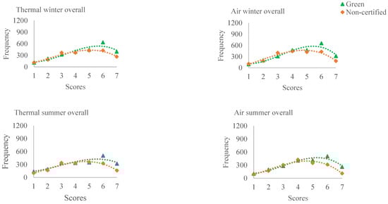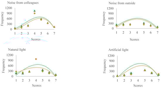 Figure 2, the curves reach their peaks almost in the middle of the 7-point scale values for noise and lighting parameters, while for thermal comfort and air quality, the curves are slightly skewed towards the upper band, indicating that thermal comfort and air quality achieved better scores in comparison to noise and lighting parameters for both green and non-certified buildings.