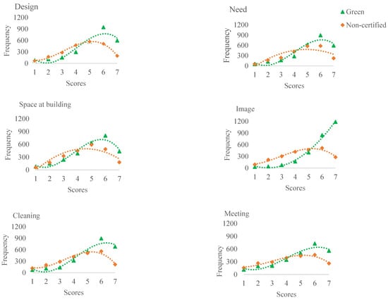Figure 3, the gaps between the two curves were much more obvious for design, image of the building, and cleaning. This illustration further confirms that green buildings outperform their non-certified counterparts by obtaining moderately better scores for design, image of the building, and cleaning. For green buildings, the curves reach their peaks closer to a score of 7 for all operational parameters, while for non-certified buildings, the peaks are slightly closer to the middle point in the 7-point scale.