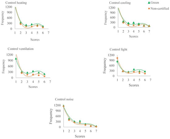 p-value < 0.001). For all parameters, green buildings obtained a better score, indicating that green buildings outperformed non-certified buildings for all perceived personal control parameters, including heating (ΔM = +0.37), cooling (ΔM = +0.41), ventilation (ΔM = +0.87), lighting (ΔM = +0.69), and noise (ΔM = +0.23). Personal controls asked occupants how much control they had over adjusting heating, cooling, ventilation, lighting and noise in their work areas.