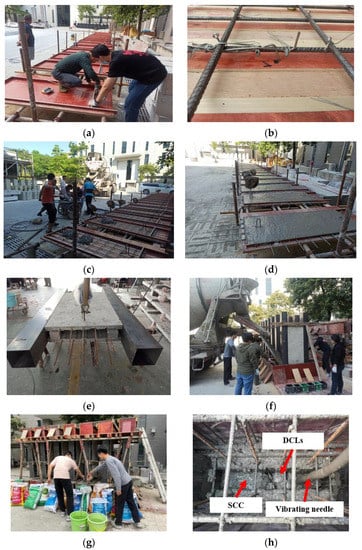 Concrete casting of specimens. (a) Formwork; (b) Thermocouple arrangement; (c) Precast wallboard pouring; (d) Precast wallboard pouring completed; (e) Precast wallboard and steel pipe assembling; (f) Casting of foundation beam; (g) Wet DCLs; (h) Cavity pouring. The variables studied experimentally included fire exposure time, fire-retardant coating on the edge constraint steel pipe column, and the width-thickness ratio. The basic parameters of each specimen are detailed in Table 1.