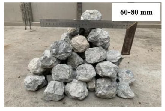The core samples of 75 × 75 mm (diameter × height) were obtained from the waste foundation beams by the core drilling method before the waste concrete was broken, and the compressive strength of the core samples was measured on the test day. According to the Technical specification for testing concrete strength with drilled core, the cubic compressive strength was converted to 39.7 MPa. The waste concrete used in this experiment was artificially broken into DCLs with characteristic dimensions of 60~80 mm (Figure 3). Then, the finished DCLs and SCC were placed alternately into the cavity of the precast wall panels and the square steel pipes, with auxiliary vibration. The detailed casting process of specimens can be found in reference [].