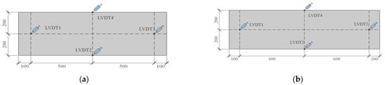 Arrangement of LVDTs on specimens (unit: mm). (a) Arrangement of LVDTs on SW2 and SW3; (b) Arrangement of LVDTs on SW4.
