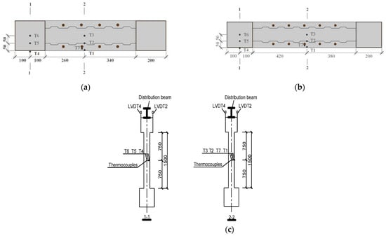 Arrangement of thermocouples in specimens (unit: mm). (a) Arrangement of thermocouples in SW2 and SW3; (b) Arrangement of thermocouples in SW4; (c) Thermocouples side profile.