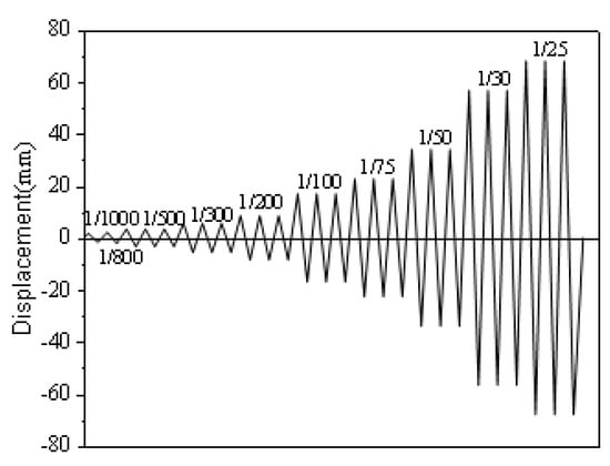 At the beginning of the test, a predetermined vertical load was first applied to the shear wall specimen and then a repeated push–pull horizontal load was applied under the condition that the vertical load was basically stable. In this test, we adopted displacement control [], and the specific loading system is shown in Figure 8. The displacement angle values of each stage are shown in Table 3.