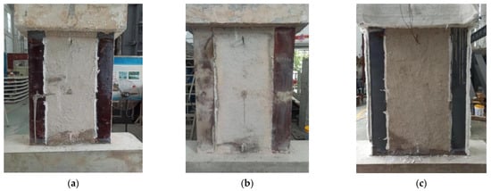 The patterns of specimens after the open fire test are shown in Figure 9. It can be observed from the figure that the concrete of the three specimens was light yellow after 60 min of fire, and a few horizontal cracks appeared on the concrete surface of precast wall panels on both sides of the shear walls, and the steel bars in walls were not exposed. The outer surface of steel tubes on the concealed columns of SW2 and SW4 were mostly dark black, and steel tubes had a slight buckling phenomenon; SW3 was equipped with fire-retardant coating on the steel tubes of concealed columns, so the steel tubes did not appear bulging and were relatively flat.