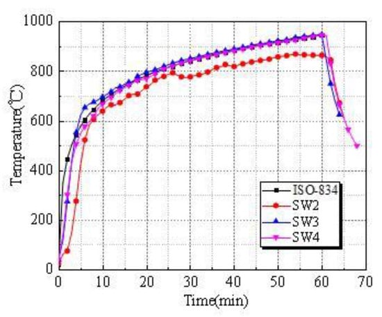 Figure 10 shows the comparison of the measured average air temperature–exposure time curves in the furnace and ISO-834 standard fire curve, the actual fire heating curves have diversity, in order to unify and compare, many countries and organizations have formulated the standard fire heating curve for the component fire resistance test to assess the component fire resistance limit [], during the open fire test of SW2 to SW4 in this test. It can be seen that the measured heating curves of SW3 and SW4 were generally consistent with the standard fire curve, while there were certain deviations in the furnace heating curve of specimen SW2. This was because the experimental furnace had not been used for four months before this test, and the workability of this experimental furnace was affected by moisture. After the open fire test of SW2, the workability of this furnace returned to normal.
