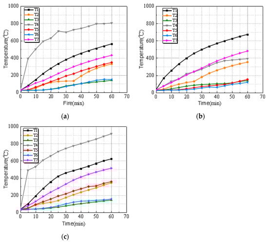 The embedded thermocouples were at half the height of specimens and were used to measure the internal temperature field. There were seven thermocouples embedded in each specimen (SW2 to SW4) among which T1 was located inside the prefabricated wall panel at a distance of approximately 5 mm from the fire surface; T2 was approximately 50 mm from the fire surface; T3 was approximately 100 mm from the fire surface; T4 was attached to the outer wall of the square steel tube; T5 was located at the midpoint of the connection between the concrete center and the outer wall of the square steel tube; T6 was located at the concrete center of the edge-constrained steel tube core; and T7 was close to the vertical steel bars, measuring the temperature field of vertical steel bars during the open fire test. The arrangement of each thermocouple is shown in Figure 7.