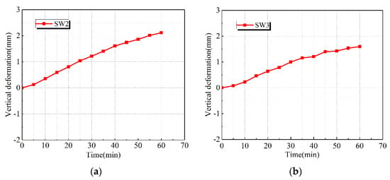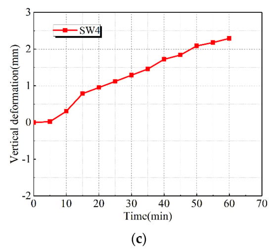 Vertical deformation–time curves of specimens. (a) SW2; (b) SW3; (c) SW4.