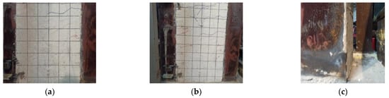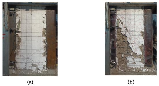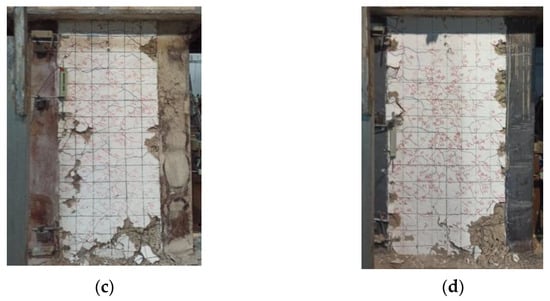 In the test process, the failure characteristics of SW1 were similar to those in reference [], and the failure characteristics of SW2 to SW4 were roughly the same. Taking specimen SW2 as an example, the failure process, phenomenon, and characteristics were analyzed and introduced. Figure 14 shows the failure process and phenomenon of SW2.