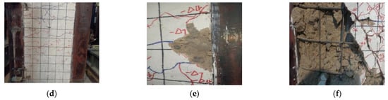 Failure processes and modes of specimen SW2. (a) Displacement angle 1/800; (b) Displacement angle 1/500; (c) Displacement angle 1/300; (d) Displacement angle 1/200; (e) Displacement angle 1/50; (f) Displacement angle 1/30.