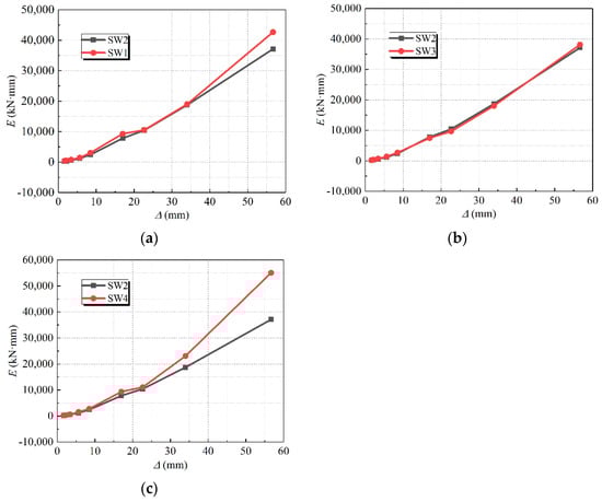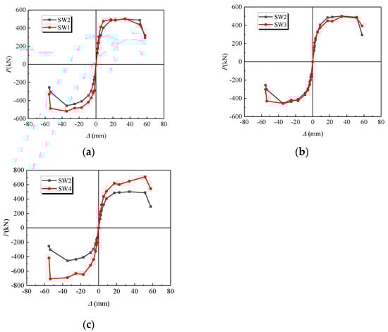 Figure 16 shows the effect of different parameters on the skeleton curves of shear walls. The important data for the skeleton curves of specimens are given in Table 4, where Py, Pue, and Pul represent the yield load, peak load, and ultimate load of specimens, respectively, and ∆y, ∆p, and ∆u represent yield displacement, peak displacement, and ultimate displacement, respectively. The yield load and the yield displacement were determined on the skeleton curves according to the Park method []. Ultimate load refers to the load size when the horizontal load dropped to 85% of the peak load. It can be seen from Figure 16 and Table 4 that:
