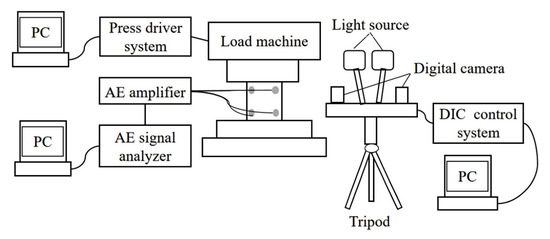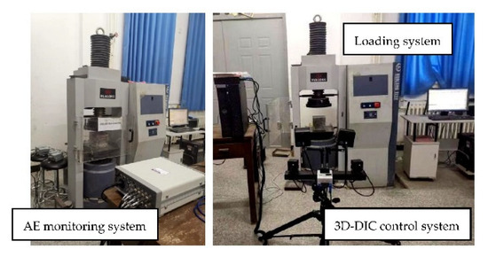 The DIC method is a new digital method for the calculation of strain. Compared with other nondestructive testing techniques, DIC provides a more intuitive perspective and more accurate damage location, especially during the evolution of the failure mode of concrete and geotechnical composite materials, which has obvious utility for monitoring and gauging significance [29,30,31,32]. Pour et al. [33] used DIC to study the sub-macro-scale strain distribution and evolution of sandstone and concrete specimens. Li et al. [34] used DIC to study the difference between the cracking behavior of simulated recycled aggregate concrete (RAC) and finite aggregate concrete specimens under compressive loading. Fan Xiangqian et al. [35] used acoustic emission to evaluate the concrete damage process and verified the reliability of the evaluation method using DIC by comparison with strain test results. Liu et al. [36] combined DIC and AE to study the mechanical properties of lattice reinforced concrete.