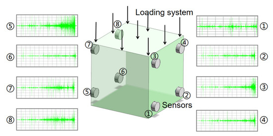 To reduce the acoustic impedance difference between the sensor and the detection surface, improve the accuracy of the compression test monitoring data, and enhance the positioning effect, Vaseline was used as the coupling agent, and the sensors were fixed to the specimen surface by adhesive tape ties. The acoustic emission sensors were arranged around the concrete specimen, and eight sensors were arranged on the cubic specimen for this test. The placement positions are shown in Figure 3.