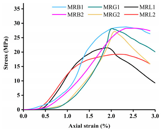 The test results of the mortar rubble specimens under uniaxial compression loading are shown in Table 7. The load-deformation curves of the six groups of mortar rubble are shown in Figure 4. According to the slopes of the stress-strain curves, the loading process was divided into four stages, i.e., the initial stage, the crack growth stage, the peak stage, and the damage stage. In the initial stage of loading, the slope of the stress-strain curve of the mortar rubble was low. When the axial strain was greater than 0.5%, the loading rate increased rapidly, and the stress-strain curve of the mortar rubble exhibited an inflection point, then showed a linear relationship. When the axial strain was greater than 1.5%, the loading rate of the stress-strain curve was slower, and a second inflection point was observed. After the stress reached peak point C, it maintained a longer smooth shape after the load gradually decreased until damage occurred. Compared with the basalt and granite specimens, the peak strength of the limestone aggregate was the lowest, and the specimens reached the peak strength soonest. The strength of the mortar rubble was relatively low. The granite and basalt mortar rubble had stronger plastic breaking capacities. The comprehensive test results revealed that the compressive strength of mortar rubble was better when the ratio of aggregate in mortar rubble was 1:2.